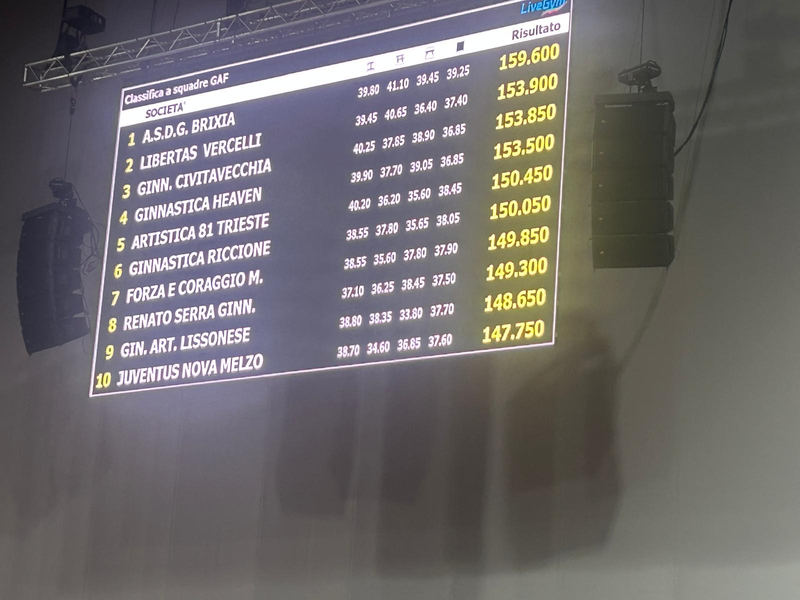 Dopo una prima fase equilibrata, la Brixia ha cambiato passo alle parallele asimmetriche grazie alle prove di Asia D’Amato (14.300) e Martina Maggio (13.500), prendendo il comando della gara. Alla trave, esercizi di altissimo livello hanno poi consolidato il primato, riportando le nostre bresciane sul gradino più alto del podio.